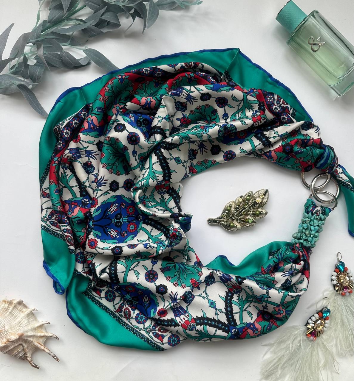 Дизайнерська хустка "Смарагдовий шовк" від бренда My Scarf, прикрашена натуральним каменем бірюза